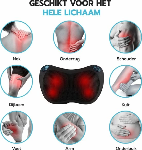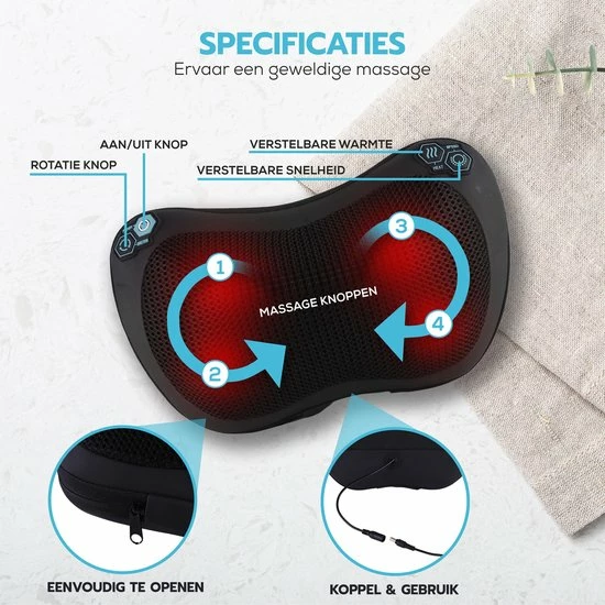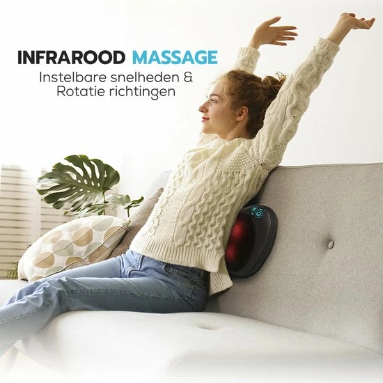 Een shiatsu massage verlicht bepaalde fysieke pijn die is veroorzaakt door stress en spanning. Het massagekussen met infraroodwarmte is een goede keuze als je veel achter een bureau zit of last hebt van stijve spieren. De warmte in combinatie met de instelbare roterende massagekoppen zorgt voor een overheerlijke massage. Stel het apparaat in zoals jij wilt en geniet elke dag weer.