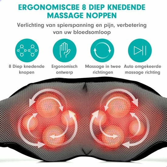 Met 8 massageballen en 2 sterke motoren ben jij verzekerd van een diepe massage zonder dat je er iemand voor hoeft te vragen. Of je nou spierklachten hebt of gewoon wilt ontspannen, ons shiatsu kussen is perfect voor elke soort massage.