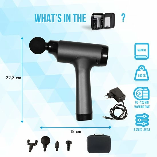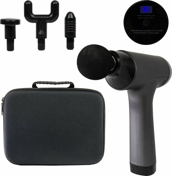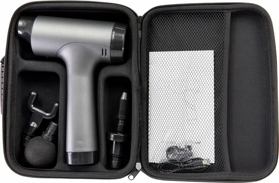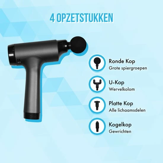 De Massage Gun Pro wordt geleverd met vier verschillende massagekoppen. Elk heeft zijn eigen functie. Zo is er een groot balvormig opzetstuk dat geschikt is voor ferme massage van de grotere lichaamsdelen. Denk hierbij aan bovenbenen, onderrug en kuiten. Het U-vormige opzetstuk is geschikt om op en rond de wervels te masseren. De kogelvormige massagekop is weer wat verfijnder en geschikt voor het losmaken van gewrichten. Tot slot is er nog een plat universeel opzetstuk dat je voor alle lichaamsdelen kunt gebruiken.
