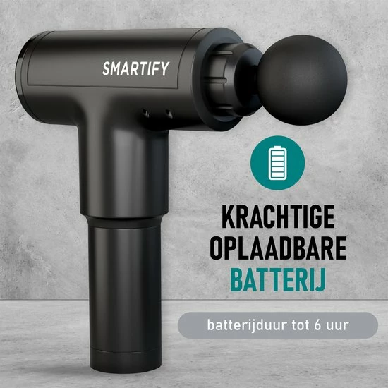 De SMARTIFY Massage Gun heeft een 2500 mAh oplaadbare accu, deze accu is volledige opgeladen in 2 uur en is 3,5 uur lang te gebruiken per laadbeurt. Dankzij de Lithium-Ion batterij gaat deze ook lang mee en ondervind de massage gun minder snel accu vermoeidheid. Zo behoud de SMARTIFY Massage Gun langer zijn kwaliteit.