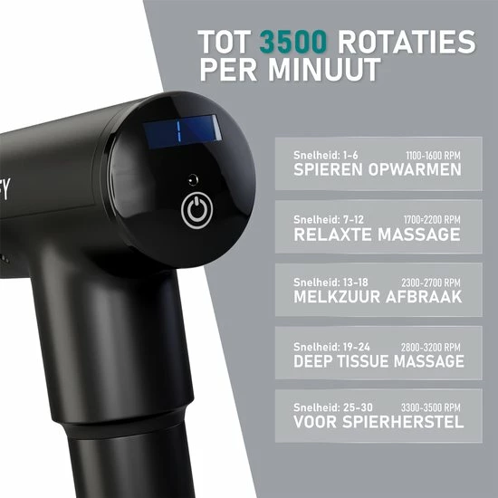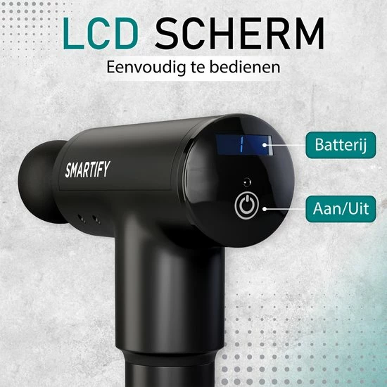 Maak gebruik van 6 verschillende snelheden om elke spiergroep anders aan te pakken. Zo kun je gemakkelijke elke spier los maken of jezelf even tot rust laten komen. Je schakelt gemakkelijk tussen alle snelheden door het LCD touchpanel op de achterkant van de massage gun in te drukken. Dankzij de 3600 rpm/min sterke motor in ons massage apparaat kun je spieren diep raken, tot in de kern. De sterke motor biedt de mogelijkheid om stijf spierweefsel te raken, of je spieren goed warm te maken voor inspanning. Houdt de AAN/UIT knop eerst 2 seconden aan om de SMARTIFY Massage Gun AAN te zetten, doe hetzelfde om deze UIT te doen.