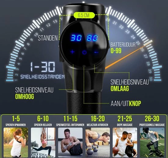 Daardoor is dit spier massage apparaat geschikt voor allerlei soorten massage. Niet alleen voor een goede sportmassage, maar ook voor een ontspanningsmassage en stress relief. Verder is de massage gun geschikt voor specialistische massages, zoals de deeptissue of een triggerpoint massage.