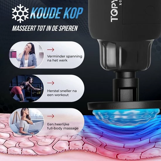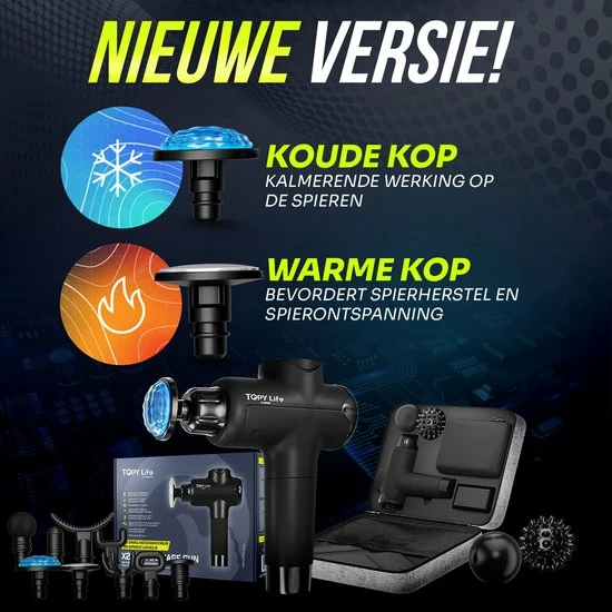 Dit is de enige massage gun op de markt die met een warme ?n koude kop geleverd worden. Beide koppen kunnen gebruikt worden om tot diep in de spieren door te dringen en de spieren optimaal te masseren. Een massagekop die warm wordt kan de spanning in de spieren sneller verminderen. De warme kop heeft daarnaast als voordeel dat het een kalmerende werking op het lichaam heeft. Of gebruik de koude kop voor een verfrissende massage nadat je veel hebt lopen zweten tijdens een training en de spieren sneller wilt laten herstellen.