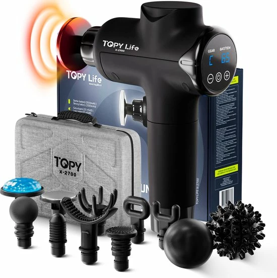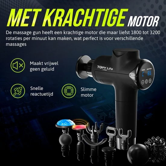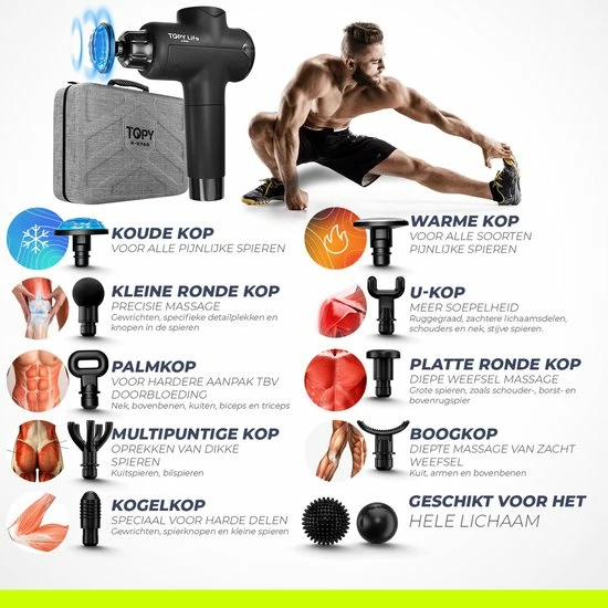 ? Inclusief 11 opzetstukken ? De massage gun wordt geleverd inclusief 11 verschillende opzetstukken, waaronder een boogkop, multipuntige kop, kleine ronde kop, U-kop, palmkop, platte ronde kop, kogelkop, warme kop, koude kop, stekelige bal en rubberen bal. Iedere kop heeft zijn eigen functie en kan voor verschillende spiergroepen gebruikt worden.