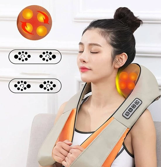 Met behulp van de cirkelvormige bewegingen van de hoofden imiteert ons apparaat de bewegingen van bekwame massagetherapeuten Shiatsu – een Japanse massagetechniek die ook bekend staat als acupunctuur zonder naalden. De massagekraag ontspant gespannen spieren, waardoor de pijn vermindert en de bloedcirculatie verbetert.