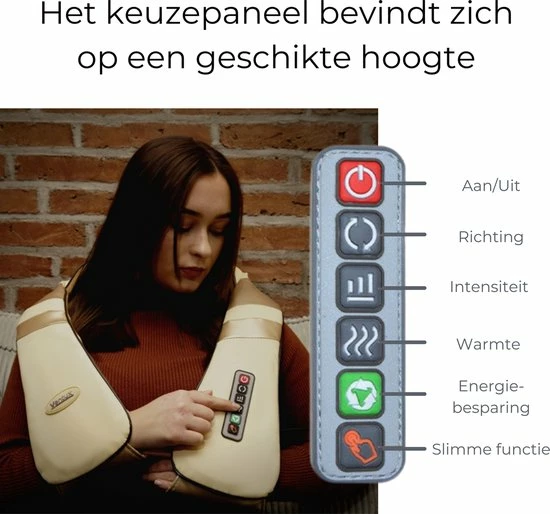 Het Ventux nekmassage apparaat is erg gebruiksvriendelijk. Steek je armen simpelweg door de lussen, hou het massagekussen tegen je schouders en de massage kan starten! Ook is het nekmassage apparaat makkelijk te bedienen door de ergonomische hoogte van het bedieningspaneel, waardoor je de gewenste intensiteitsstand en de warmtefunctie kunt verstellen, zonder je massage te hoeven onderbreken.