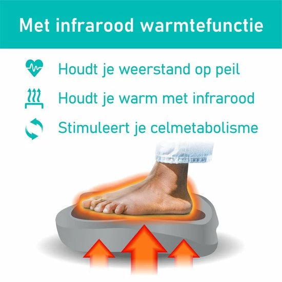 Onder elke voet maar liefst 9 massagekoppen die roterende bewegingen maken en zorgen hierdoor voor een heerlijke ontspannende massage, gun jezelf dat moment. Wanneer je de start knop 2 keer indrukt schakelt de infrarood in waardoor je voeten lekker warm worden en de afvalstoffen nog beter afgevoerd kunnen worden. Zo verbeter je niet alleen de bloedsomloop maar verminder je ook pijnlijke voeten en benen en verlicht je de spanning in je hele lichaam.