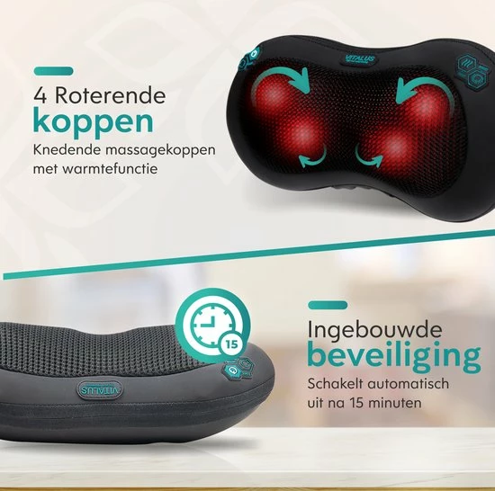 Ons product is ook voorzien van oververhittingsbeveiliging wat inhoudt dat het kussen automatisch uitschakelt na 15 minuten. Jouw welzijn staat bij ons hoog in het vaandel. Daarom raden wij ook aan om het kussen niet langer dan 15 minuten per dag te gebruiken. Te lang masseren kan de huid namelijk beschadigen.