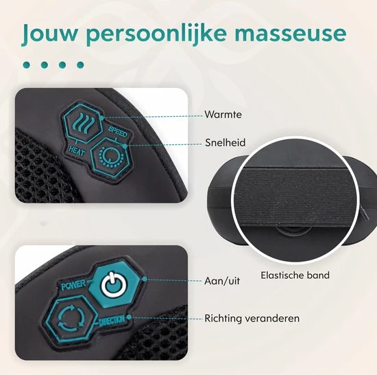 Het massagekussen is gemakkelijk te bedienen met de 4 knoppen die zijn bevestigd op de zijkant. Door de verschillende instellingen kan je veel vari?ren en geeft het jou de vrijheid om de massage aan te passen naar jouw persoonlijke voorkeur. Je kan de volgende dingen instellen