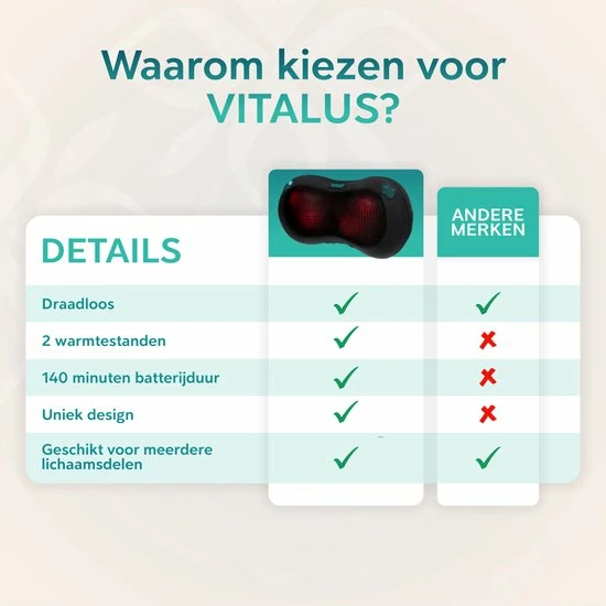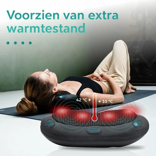 Het massagekussen van Vitalus is draadloos en kan daardoor overal gebruikt worden. Daarnaast is het kussen van voorzien van 2 warmtestanden zodat jij de warmte kan instellen naar jouw persoonlijke voorkeur. De temperatuur varieert van 33? tot 42?